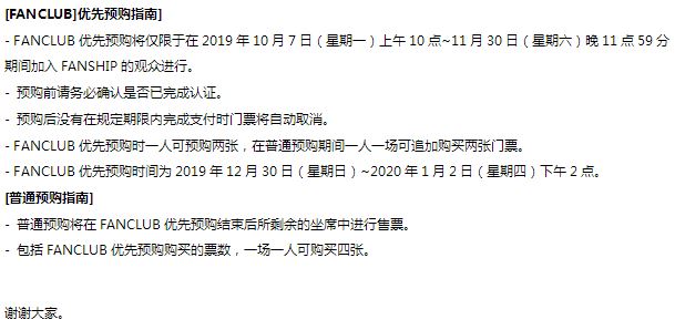 - Fanclub Pre-purchase tickets are available for those who joined FANSHIP from October 7th, 2019 (Mon) 10AM ~ November 30th, 2019 (Sat) 23:59PM.