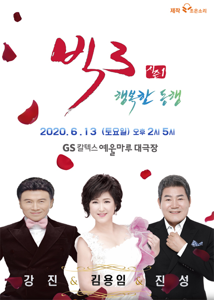 -공연이름 : 빅3“행복한 동행”콘서트(진성, 김용임, 강진) - 여수 -공연일시 : 2020년 2월 15일 토요일 -공연시간 : 오후 2시, 5시 -공연장소 : GS칼텍스 예울마루 대극장 -티켓가격 : VIP석 99,000 / R석 77,000 -관람등급 : 만 7세 이상 -관람시간 : 120분(인터미션 : 0분)