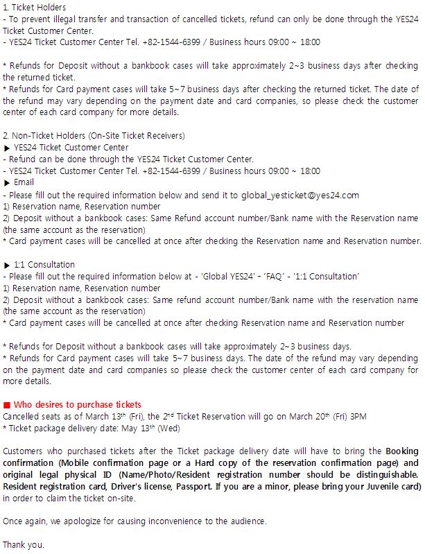 티켓의 환불을 원하는 관객 분들께는 아래의 절차에 따라 수수료를 포함한 티켓 전액을 환불해드릴 예정입니다.