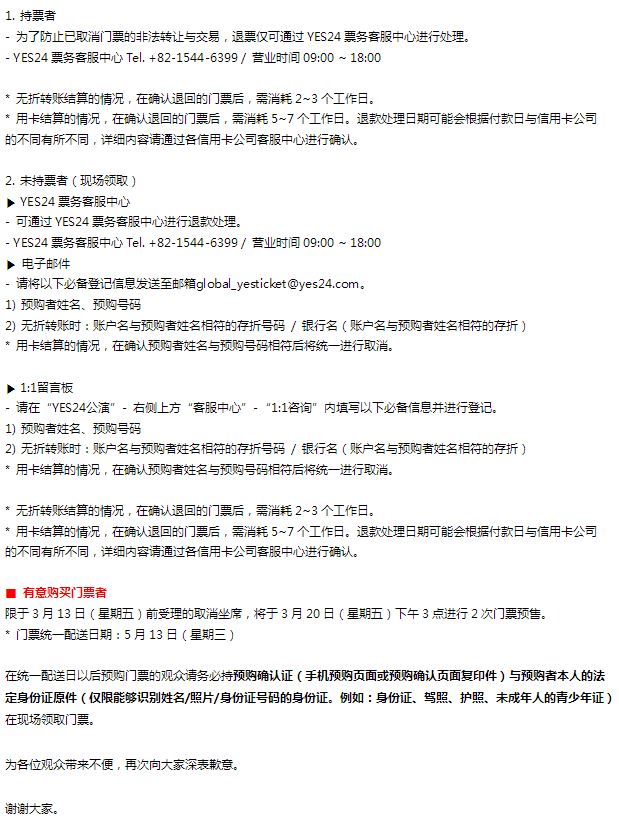 - YES24 티켓 콜센터를 통해 환불 접수가 가능합니다.