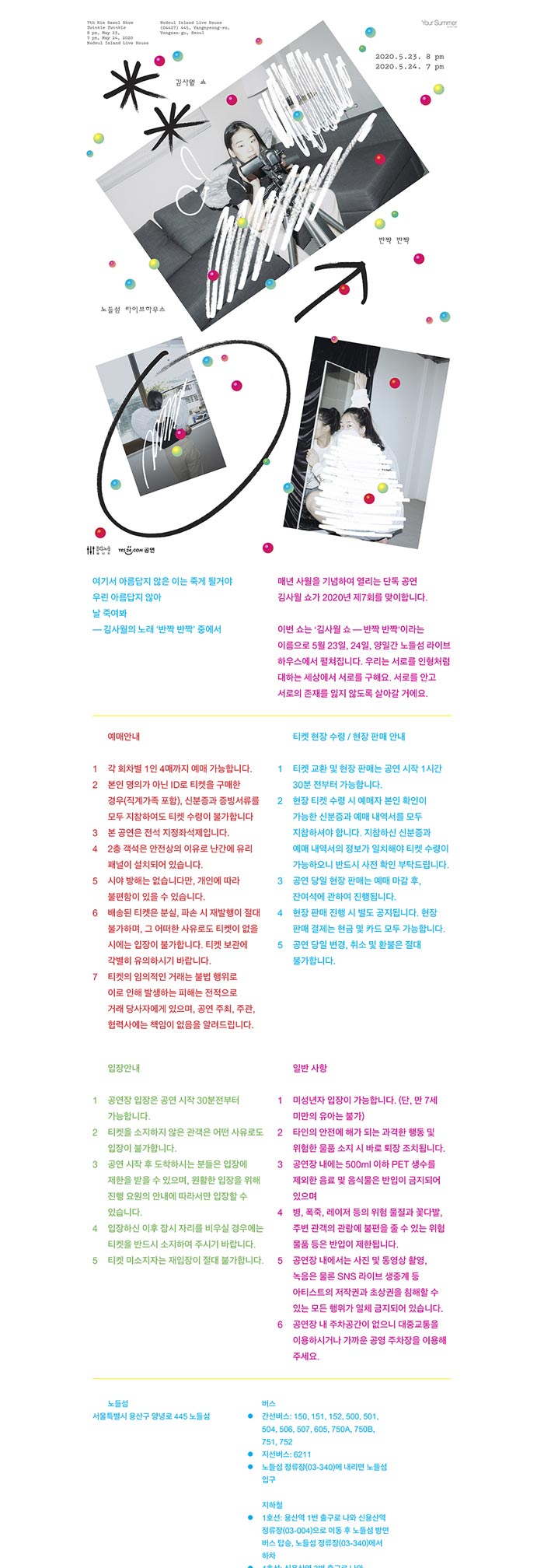 공연 제목 : 김사월 쇼 : 반짝 반짝 공연 기간 : 2020.05.23 ~ 2020.05.24 (2일) 공연 시간 : 2020.05.23 8PM, 2020.05.24 7PM 공연 장소 : 노들섬 라이브하우스 티켓 가격 : 예매/현매 55,000원