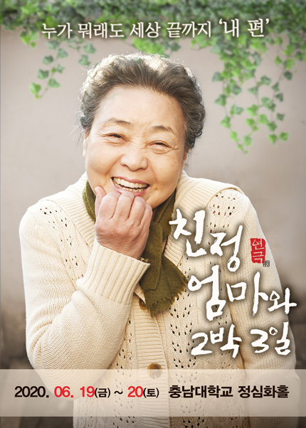 - 공연제목 : 연극 [친정엄마와 2박3일] - 대전 - 공연기간 : 2020년 6월 19일(금) ~ 6월 20일(토) - 공연시간 : 금 오후 7시 30분 / 토 오후 2시, 6시 - 공연장소 : 충남대학교 정심화홀 - 관람연령 : 만 7세 이상 - 러닝타임 : 100분