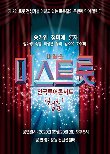 - 공 연 명 : 내일은 미스트롯 전국투어 청춘 콘서트 - 창원 - 공연일시 : 2020년 6월 20일(토) - 공연시간 : 20일 토요일 오후 5시 - 공연장소 : 창원컨벤션센터 - 티켓가격 : VIP석 121,000원/ R석 110,000원/ S석 99,000원/ A석 88,000원 - 관람등급 : 만 7세 이상 관람가 - 관람시간 : 약 120분