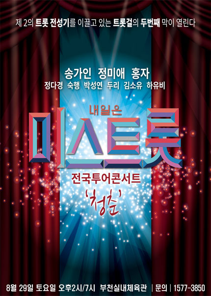 - 공 연 명 : 내일은 미스트롯 전국투어 청춘 콘서트 - 부천 - 공연일시 : 2020년 7월 11일(토) - 공연시간 : 오후 2시, 7시 - 공연장소 : 부천 실내 체육관 - 티켓가격 : VIP석 121,000원/ R석 110,000원/ S석 99,000원/ A석 88,000원 - 관람등급 : 만 7세 이상 관람가 - 관람시간 : 약 150분
