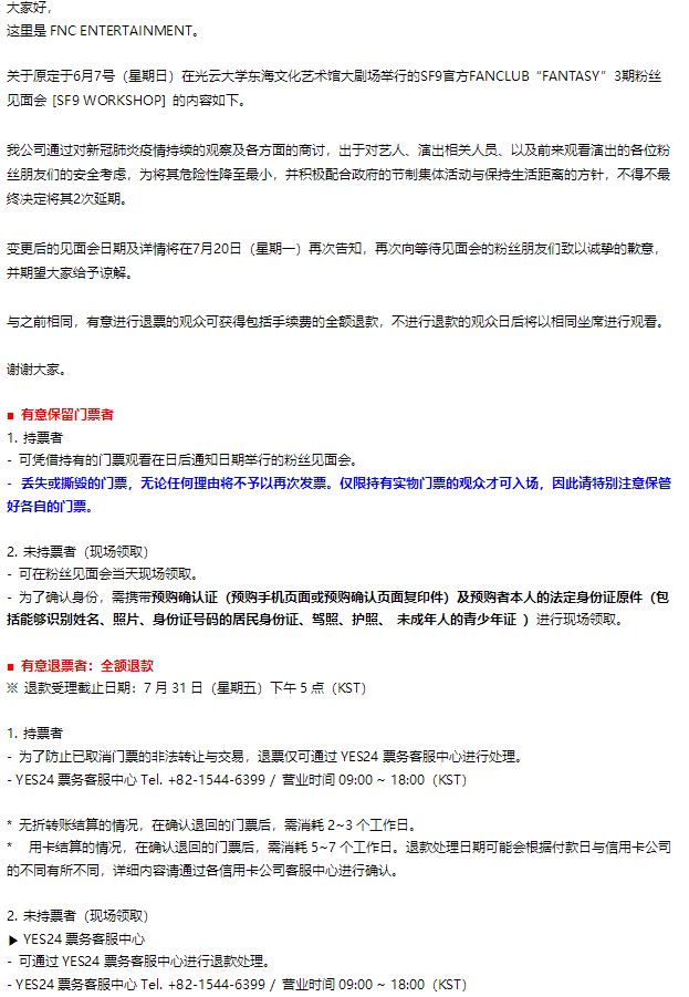일전과 동일하게 티켓의 환불을 원하시는 관객 분들께는 수수료를 포함한 티켓 전액을 환불해드릴 예정이며, 환불을 원하지 않는 관객 분들은 추후 예정된 팬미팅에 동일 좌석으로 입장을 도와드릴 예정입니다.
