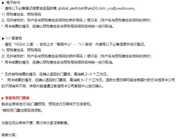 - To prevent illegal transfer and transaction of cancelled tickets, refund can only be done through the YES24 Ticket Customer Center.