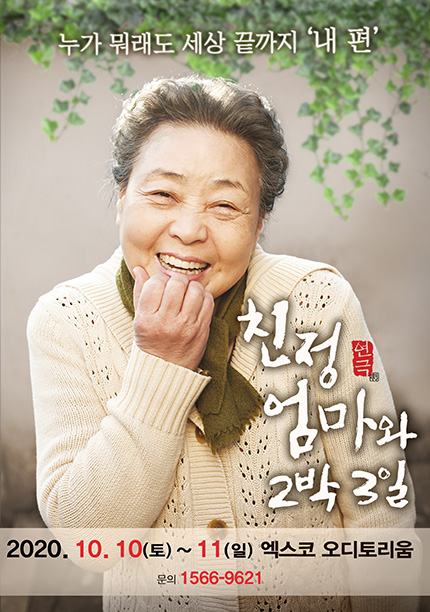 - 공연명 : 연극 <친정엄마와 2박3일> - 대구 - 공연일시 : 2020년 10월 10일(토)~11일(일) - 공연시간 : (토) 오후 2시, 6시 (일) 오후 2시 - 공연장소 : 엑스코 오디토리움 - 티켓가격 : R석 77,000원 / S석 66,000원 - 관람등급 : 만 7세 이상 - 관람시간 : 100분