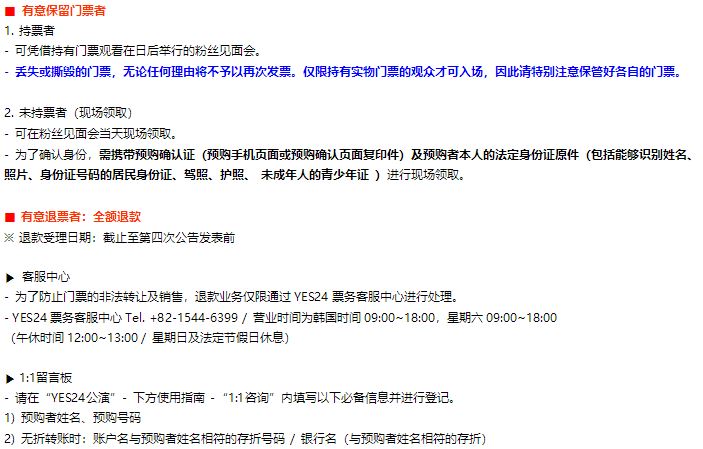 - To prevent illegal transfer and transaction of cancelled tickets, refund reception can only be received through YES24 Ticket Customer Center.