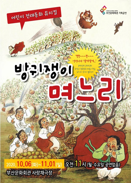 공연일시 : 2020.10.06(화)~11.01(일) 오전 11시 공 연 장 : 부산문화회관 사랑채극장 티켓가격 : 전석 2만원 관람연령 : 24개월 이상 문 의 : 051-607-6000(ARS1번)
