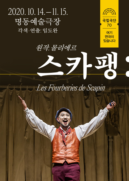 관객과 평단의 압도적 찬사를 받은 몰리에르 원작의 <스카팽>이 1년 만에 돌아온다. 주인을 속이고 농락하며 벌어지는 17세기식 좌충우돌 해프닝은 임도완 연출을 만나 오늘의 이야기로 변신한다. 고전의 뼈대에 현대적 감성을 입힌 유쾌한 조롱은 객석을 빵빵 터뜨리며 통쾌함을 선사한다. 촘촘하게 짜인 대사와 만화를 찢고 나온 듯 통통 튀는 움직임은 캐릭터에 생명을 불어넣어 입체감을 더하고, 오감을 간지럽히는 다양한 효과음들은 당신의 상상력을 자극한다. 재공연 요청이 끊이지 않았던 <스카팽>은 톱니바퀴처럼 서로 맞물리는 앙상블의 하모니로 다시 한 번 객석을 뒤흔들 준비가 되어있다. 웃을 일 없는 요즘, 한바탕 크게 소리 내어 웃고 싶다면 이번에는 놓치지 말길.