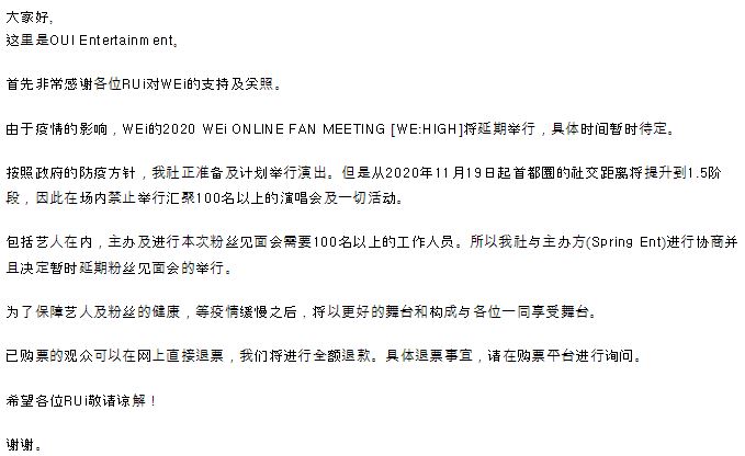 다시 한 번 위아이(WEi) 2020 WEi ONLINE FAN MEETING [WE:HIGH]을 기다려주신 루아이 분들의 너그러운 양해를 부탁드립니다.