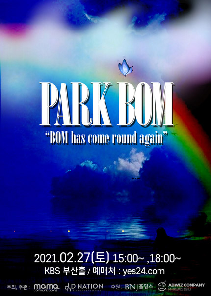- 공연명 : 박봄 콘서트 - 부산 - 공연장소 : KBS 부산홀 - 공연시간 : 2021년 2월 27일(토) 오후 3시, 6시 - 티켓가격 : VIP석 132,000원 R석 121,000원 S석 99,000원 - 관람연령 : 만 7세이상 관람 - 러닝타임 : 90분