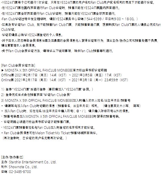 To reserve a fan club ticket, YES24 must be registered and certified (cell phone, I-PIN certification) and tickets can be purchased only for those who have completed the certification MONSTA X 5th OFFICIAL FANCLUB MONBEBE through the reservation page.