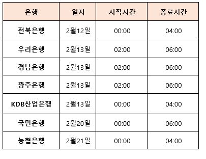 아래와 같이 은행사 시스템 점검이 예정되어 있어 안내 드립니다.