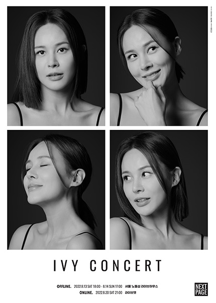 공 연 명 : 2022 아이비 콘서트 : NEXT PAGE 공연일시 : 2022년 08월 13일(토) ~ 08월 14일(일) 공연시간 : 토요일 18:00, 일요일 17:00 공연장소 : 서울 노들섬 라이브하우스 관람등급 : 8세 이상 관람가 (미취학아동 입장불가)
