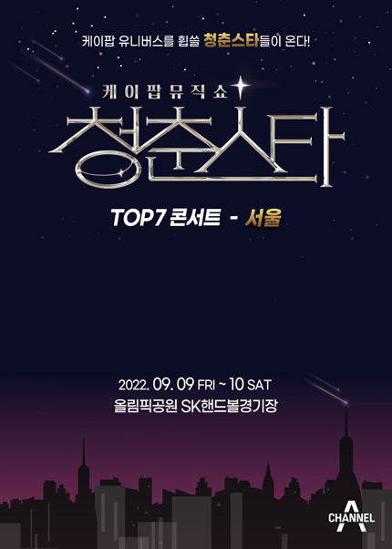 - 공 연 명 : 케이팝 뮤직쇼 청춘스타 TOP7 콘서트-서울 - 공연일시 : 2022년 9월 9일(금) ~ 9월 10일(토) 18:00 - 공연장소 : 올림픽공원 SK핸드볼경기장 - 티켓가격 : VIP석 132,000원 / R석 121,000원 / S석 99,000원 - 러닝타임 : 약 150분 - 관람등급 : 만 7세이상 (미취학 아동 입장 불가) - 매수제한 : 회차당 1인 4매