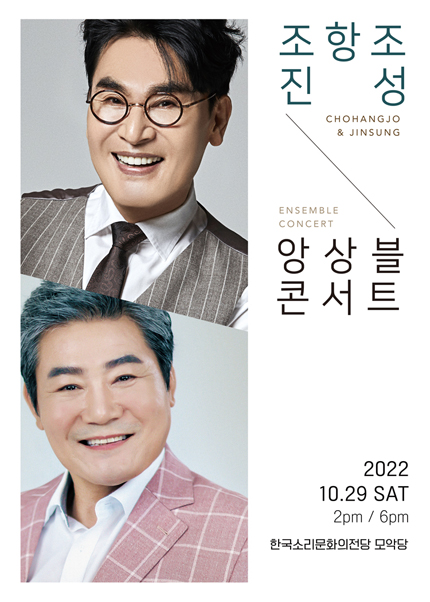 - 공연제목 : 2022 조항조&진성 <앙상블콘서트> - 전주 - 공연일시 : 2022년 10월 29일(토) 오후 2시, 6시 - 공연장소 : 한국소리문화의전당 모악당 - 티켓가격 : VIP석 132,000원 / R석 121,000원/ S석 99,000원 - 관람등급 : 만 7세이상 관람가 - 공연시간 : 120분