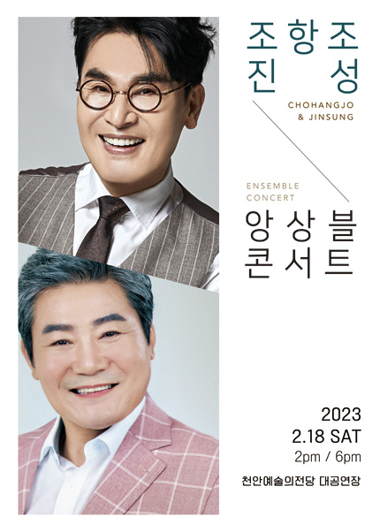 - 공연제목 : 2022 조항조&진성 <앙상블콘서트> - 천안 - 공연일시 : 2022년 11월 5일(토) 오후 2시, 6시 - 공연장소 : 천안예술의전당 대공연장 - 티켓가격 : VIP석 132,000원 / R석 121,000원/ S석 99,000원 - 관람등급 : 만 7세이상 관람가 - 공연시간 : 120분