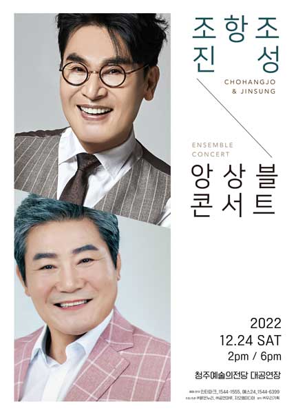 - 공연제목 : 2022 조항조&진성 〈앙상블콘서트〉 - 청주 - 공연일시 : 2022년 12월 24일(토) 오후 2시, 6시 - 공연장소 : 청주예술의전당 대공연장 - 티켓가격 : VIP석 132,000원 / R석 121,000원 / S석 99,000원 - 관람등급 : 만 7세이상 관람가 - 공연시간 : 120분
