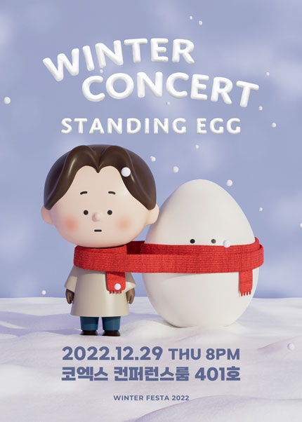 - 공 연 명: 스탠딩에그 콘서트 〈Earmuffs〉- Winter Festa 2022 - 공연일시: 2022년 12월 29일(목) 오후 8시 - 공연장소: 코엑스 컨퍼런스룸 401호 - 티켓가격: 전석 110,000원 - 관람등급: 8세 이상 - 러닝타임: 120분 - 매수한정: 회차별 1인 4매