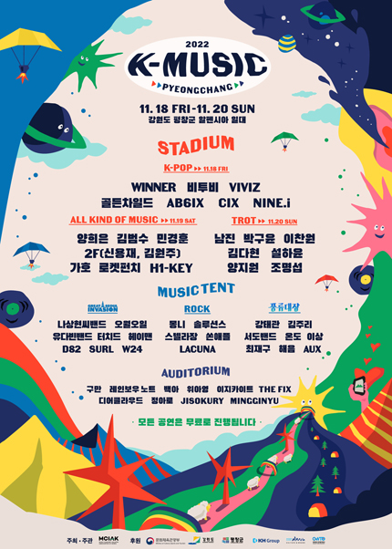- 공연명 : 2022 K-뮤직, 평창 STADIUM 〈ALL KIND OF MUSIC〉 - 공연일시: 2022년 11월 19일(토) 3PM - 공연장소 : 평창 알펜시아 STADIUM - 티켓가격 : 무료 (선착순 예매) - 관람등급 : 8세 이상 - 1인 4매 예매 가능 (한 개의 ID로 4매까지 예매 가능) - 티켓 예매 시 일괄 배송 (배송료 발생) / 배송일 : 11월 9일(수) 우체국 등기 배송