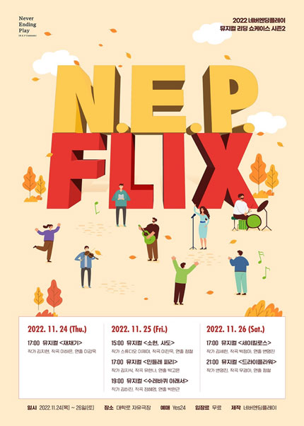 공연명: 2022 네버엔딩플레이 뮤지컬 리딩 쇼케이스 시즌2 <넵플릭스> 공연기간: 2022.11.24(목)~2022.11.26(토) 공연장: 자유극장 공연시간: 11.24(목) 17시 / 11.25(금) 15시, 17시, 19시 / 11.26(토) 17시, 21시 (공연별 상이) 공연소요시간: 45분내외 티켓가격: 무료 관람연령: 만 12세 이상