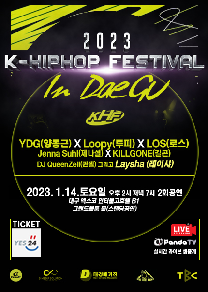 * 공연명 : 2023 K-HIP HOP Festival in DAE-GU * 공연장 : 대구 엑스코 인터불고호텔 B1 그랜드볼룸홀 * 행사일시 : 2023.01.14(토) 오후 2시, 7시 * 출연진 : 루피, 로스, YDG, 레이샤, 제나설, 길곤, DJ퀸젤