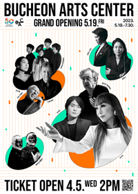 공연 제목 : 부천아트센터 개관페스티벌 공연 기간 : 2023. 5.19.(금) ~ 2023. 7.30.(일) 공연 시간 : 상세이미지 참조 공연 장소 : 부천아트센터 콘서트홀 및 소공연장 티켓 가격 : 상세이미지 참조