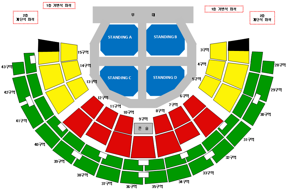 3. 스탠딩 관객의 경우, 공연시간 2시간 30분 전부터 별도로 마련된 대기공간에 줄을 서야 하며, 공연시간 2시간 전부터 입장번호순에 따라 100명씩 A,B,C,D구역 입장이 이루어집니다. 입장 시작 이후의 입장 번호는 무효가 되오니 반드시 입장시간 이전에 오시어 불이익을 당하는 일이 없으시길 바랍니다.