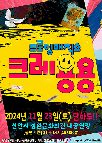 일시 : 2024년 11월 23일(토) 11시 14시 16시30분 장소 : 천안시성환문화회관 티켓 : 정가 40,000원 / 할인전가격 기본할인 22,000원 / 상시할인 조이컬쳐(천안) 카톡채널추가할인 20,000원 / 채널명 : 조이컬쳐(천안) 카톡채널 추가시할인(당일증빙) 장애인및국가유공자할인 18,000원/장애인,국가유공자 본인포함4매까지 예매가능/티켓발권시 복지카드확인 조기예매할인 18,000원/8월07일~08월 21일까지