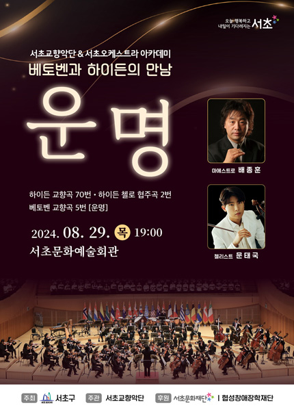 베토벤과 하이든의 만남〈운명〉 공연명 : 운명 공연일정 : 2024.8. 29.(목) 19시 공연장소 : 서초문화예술회관 아트홀 티켓가격 : 무료 관람등급 : 8세(초등학생)이상 관람가