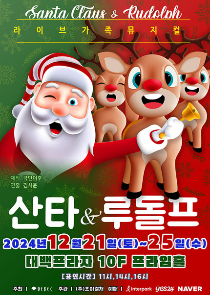 공연기간 2024.12.21~2024.12.25 공연시간 토일월화수 11시 14시 16시 공연장소 : 대백프라자10층프라임홀 정가 30,000원 / 정가 기본할인 20,000원 / 상시할인 카톡채널추가할인 18,000원 / 예매시 선할인 후증빙(당일 카톡채널 "조이컬쳐" 추가증빙/미증빙시 차액지불) 공지사항 ㅡ좌석배치도 O열에서 K열 까지는 바닥레벨이 평평한 좌석구역입니다.(예매시 참고 바랍니다) ㅡ1인 1티켓을 적용합니다.(24개월 미만 무료입장, 부모동반 입장시 적용가능-증빙서류지참) ㅡ공연중에는 사진촬영,동영상촬영,음식물반입이 금지되어 있습니다 ㅡ공연시작 30분전부터 티켓박스에서 현장예매,티켓수령 가능합니다 ㅡ어린이보조쿠션이 준비되어 있습니다 ㅡ- 당일 변경 및 취소 불가 (공연당일 현장에서의 취소, 변경, 환불은 불가하며, 개인사정, 공연 중 울고보채는 아이로 퇴장하는 경우에도 환불은 불가합니다.)