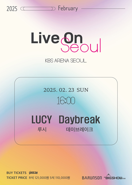 Live on 서울 (라이브온 서울) LUCY(루시) , Daybreak(데이브레이크) 일시: 2025년 2월 23일 일요일 오후 4시 장소: 서울 KBS아레나 가격: R석 121,000원 / S석 110,000 원