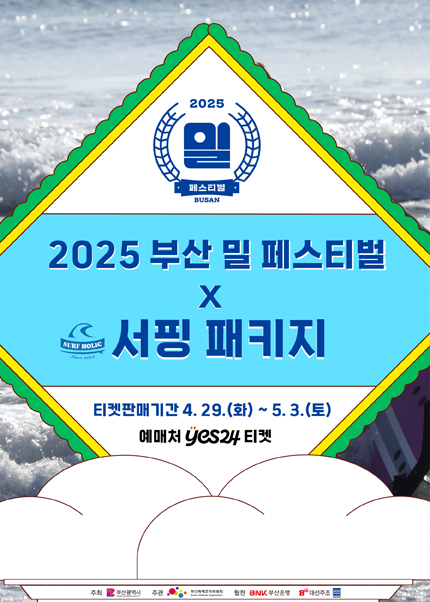 공연 제목 : 2025 부산 밀 페스티벌X서핑패키지 공연 기간 : 2025. 5. 5.(월) ~ 5. 6.(화), 서프홀릭 이용권에 한해 ~6/30까지 이용가능 공연 장소 : 부산시 북구 화명생태공원 일원, 송정해수욕장 티켓 가격 : 1인 63,000원