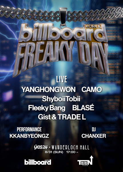 공연제목 : 빌보드코리아 프리키 데이 (Billboard Korea Freaky Day) 공연시간 : 2025년 8월 31일(일) 오후 5시 공연장소 : 예스24 원더로크홀 관람연령 : 만 12세 이상 관람시간 : 총 180분 (인터미션 30분)