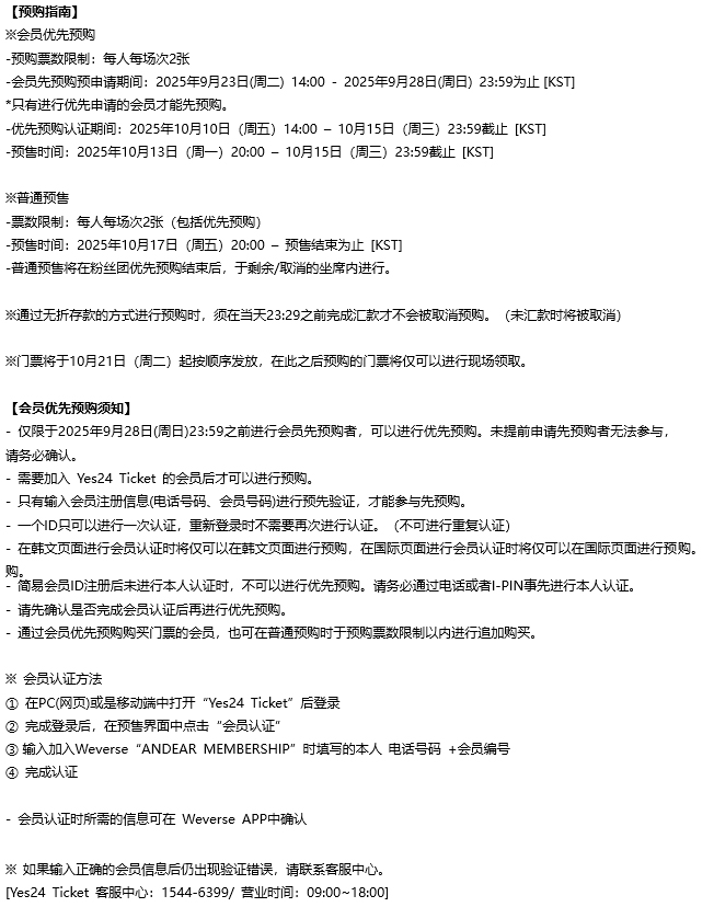 - MEMBERSHIP Pre-Ticket Purchase Period: October 13th, 2025 (Mon) 20:00 - October 15th, 2025 (Wed) 23:59 [KST]