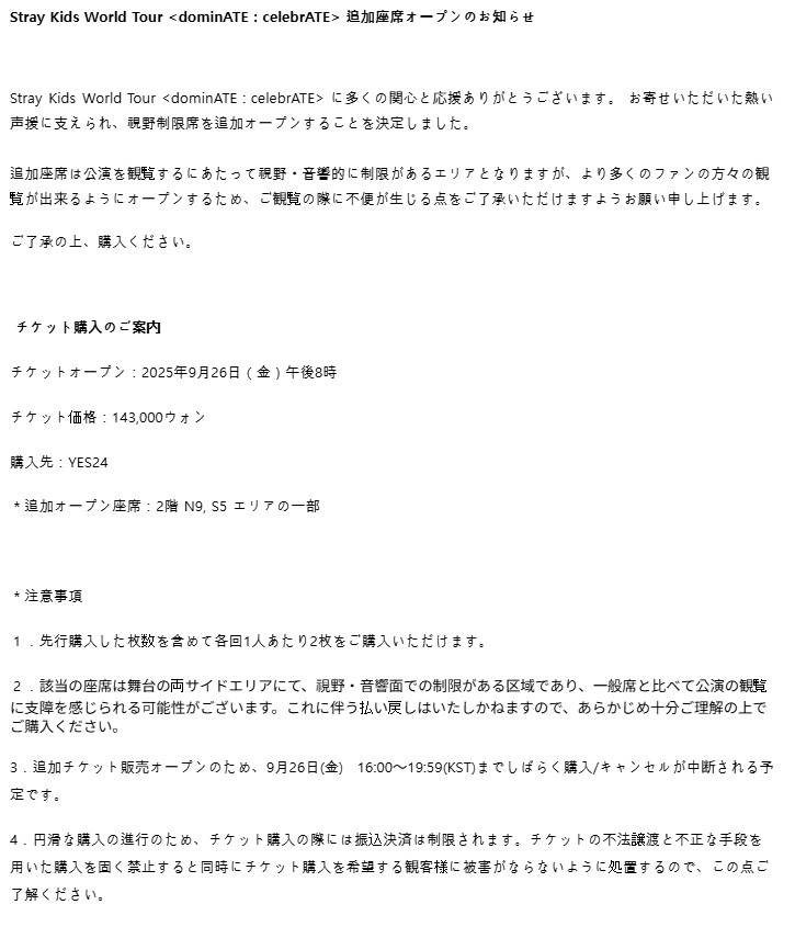 추가 좌석은 공연을 관람하시기에 시야·음향적으로 제한이 있는 구역이지만, 더 많은 팬분들이 볼 수 있도록 하기 위하여 오픈 하오니 관람 시 불편하더라도 양해 부탁드리며, 이 점 참고하시어 예매 진행 부탁드립니다.