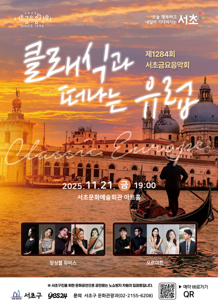 공 연 명 : 제1284회 서초금요음악회 <클래식과 떠나는 유럽> 공연일정 : 2025. 11. 21.(금) 19시 공연장소 : 서초문화예술회관 아트홀 티켓가격 : 일반 5,000원 / 서초구민 2,500원 등 관람등급 : 전체관람가