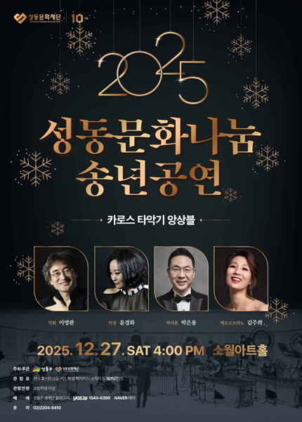 연말연시, 한 해를 마무리하며 성동문화재단이 준비한 2025 송년공연 〈카로스 타악기 앙상블〉은 다채로운 타악기 선율과 눈과 귀를 사로잡는 퍼포먼스를 통해 관객에게 몰입감 있는 예술적 경험과 깊은 감동을 전합니다.