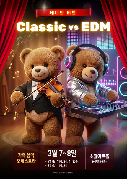 - 공 연 명 : 가족 음악 오케스트라 [테디의 비트] - 서울 - 공연일시 : 2026년 3월 7일(토) 11:00, 14:00, 16:30 / 3월 8일(일) 11:00, 14:00 - 공연장소 : 소월아트홀 - 티켓가격 : 정가 66,000원 - 공연시간 : 70분 - 관람등급 : 24개월 이상