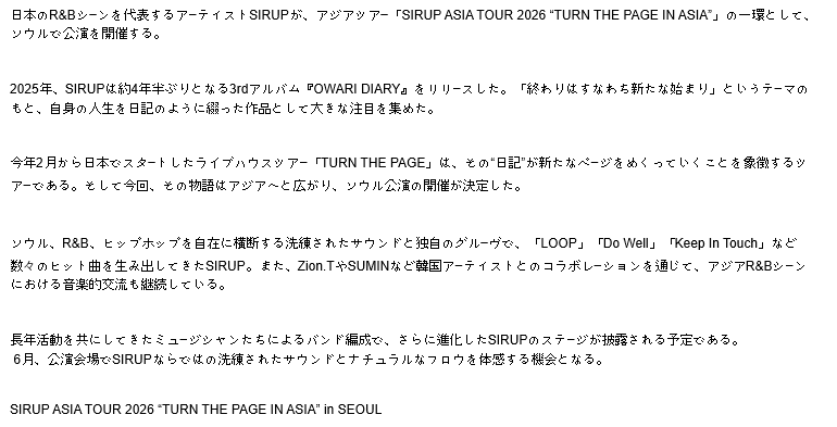 일본 R&B 씬을 대표하는 아티스트 SIRUP이 아시아 투어 ‘SIRUP ASIA TOUR 2026 “TURN THE PAGE IN ASIA”’의 일환으로 서울에서 공연을 개최한다.