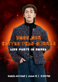 공연 제목 : BOSS.CKM HOTTER THAN SUMMER - LIVE PARTY IN KOREA - 공연 기간 : 2026.06.13 (토) 공연 시간 : 15:00 공연 장소 : 가빈아트홀 티켓 가격 : 전석 330,000 공연시간 : 100분