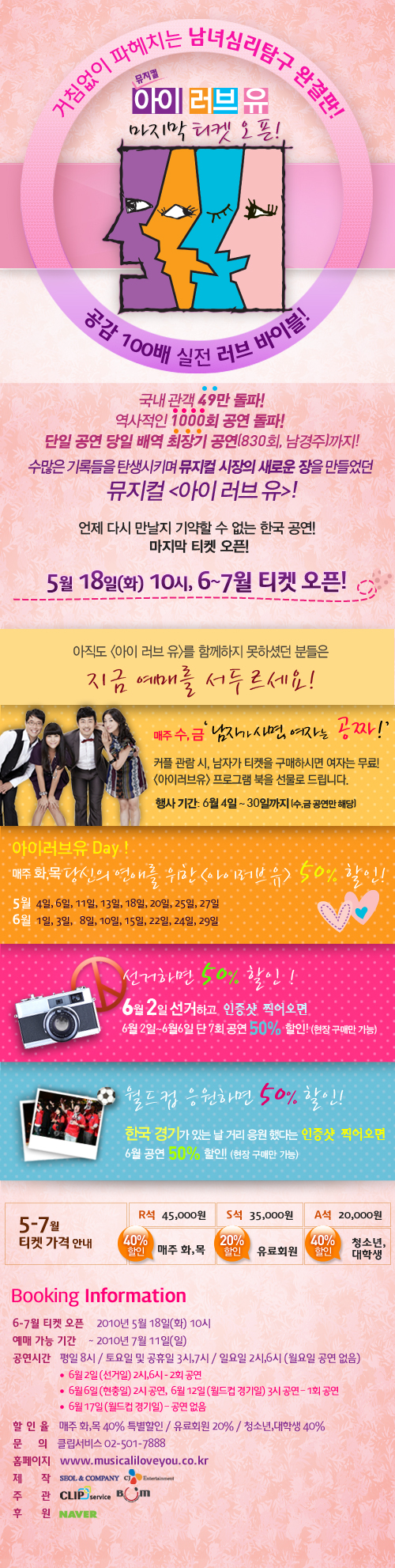 - 예매가능기간: ~2010년 7월 11일(월) - 공연시간: 평일 8시 / 토요일 및 공휴일 3시, 7시 / 일요일 2시, 6시 월요일 공연 없음 6월 2일(선거일) 2시, 6시 - 2회공연 6월 6일(현충일) 2시, 6월 12일(월드컵경기일) 3시 공연 6월 17일(월드컵 경기일) - 공연없음