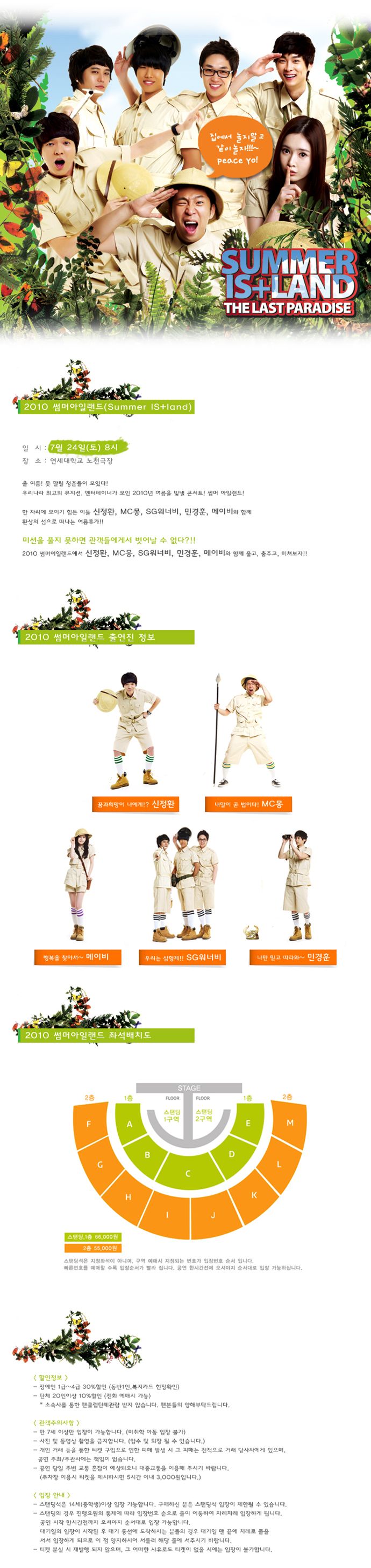 <공연정보> ■ 일 시 : 2010년 7월 24일 8시 ■ 장 소 : 연세대학교 노천극장 ■ 주최/주관 : ㈜아이에스엔터미디어그룹 ■ 티켓등급 : 스탠딩석/R석/S석 < 할인정보 > ■ 장애인 1급~4급 30%할인 (동반1인,복지카드 현장확인) ■ 단체 20인이상 10%할인 (전화 예매시 가능) * 소속사를 통한 팬클럽단체관람 받지 않습니다. 팬분들의 양해부탁드립니다.