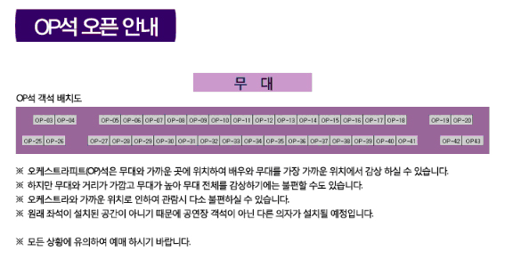 오케스트라피트 위치가 변경되어 오케스트라피트(OP)석을 판매하게 되었습니다.