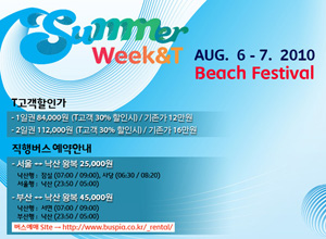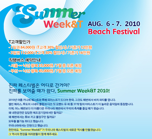 음악과 바다를 사랑하는 젊음의 비치 Festival지금 전 세계 대중음악을 지배하는 트랜드는 힙합과 일렉트로니카! 국내 최초 해변에서 펼쳐지는 초대형 음악 페스티벌 '썸머 위크앤티 2010'을 통해 록 뮤직 일변도였던 국내 페스티벌계에 생각대로T가 힙합-일렉트로닉의 새바람을 일으킵니다. 국내외 최정상 뮤지션들이 한 자리에 모여 열정적인 공연을 선보이는 초대형 음악 페스티벌 ‘썸머 위크앤티 2010’이 젊은 위캔티어들의 뜨거운 여름을 책임지겠습니다. Let’s Groove it!