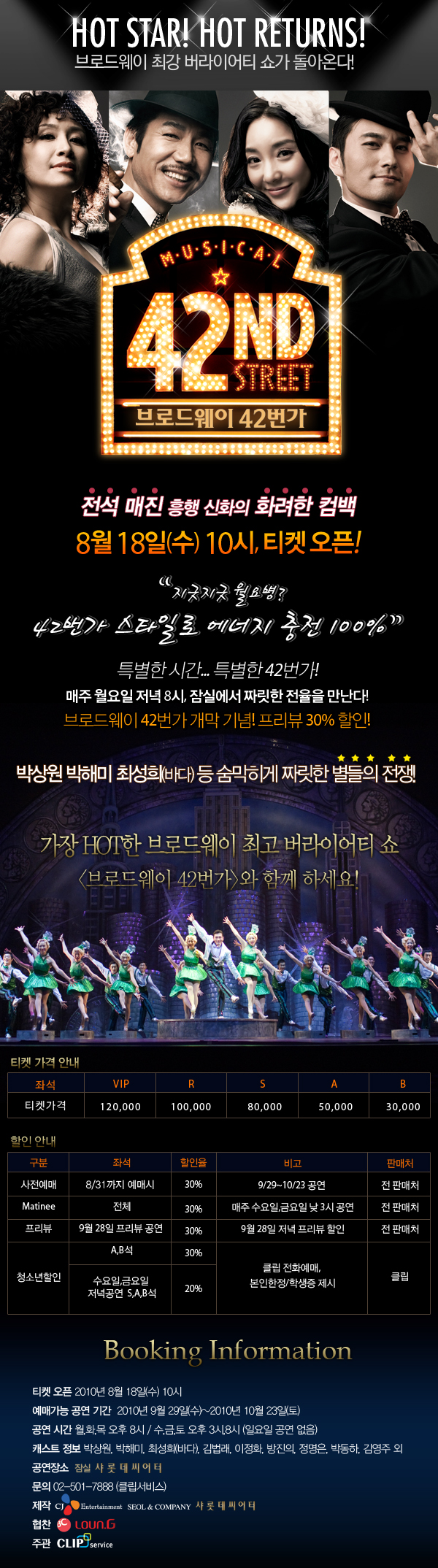 - 공 연 명 : 뮤지컬 <브로드웨이 42번가> - 공연기간 : 2010년 9월 29일(수)~11월 21일(일) - 공연장소 : 잠실 샤롯데씨어터 - 공연시간 : 월,화,목 오후8시 / 수,금,토 오후3시,8시 (일요일 공연없음) - 티켓가격 : VIP석 120,000원 / R석 100,000원 / S석 80,000원 / A석 50,000원 B석 30,000원 - 관람등급 : 8세 이상 관람가