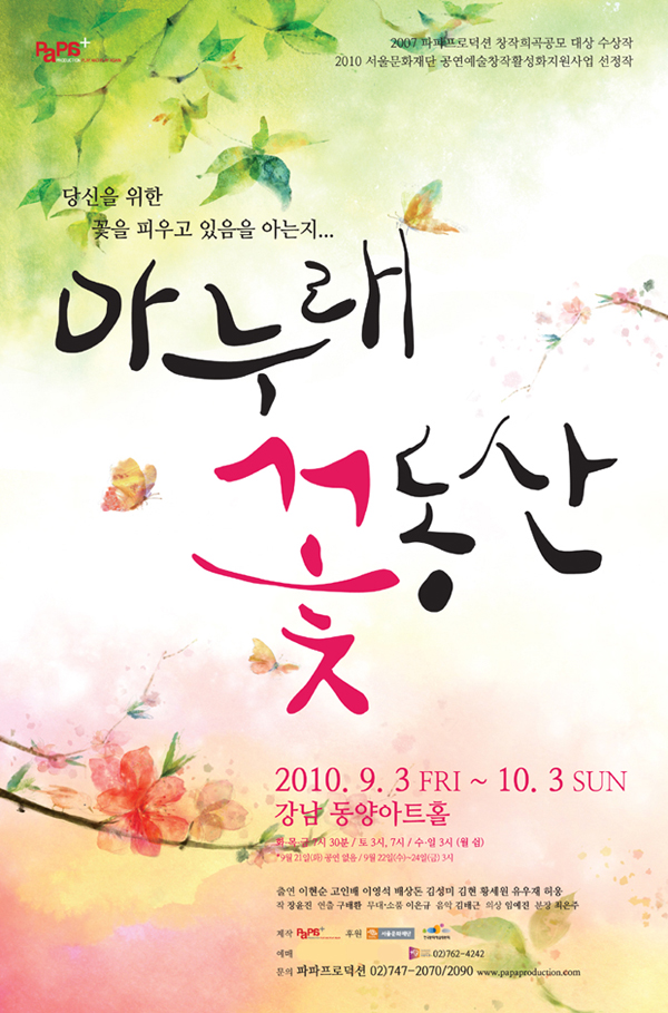 - 공연기간 : 2010년 9월 3일(금) ~ 10월 3일(일) - 공연시간 : 화,목,금 19:30 / 토 15:00, 19:00 / 수,일 15:00 (월 쉼) 단, 9월 21일(화), 9월 22일~24일 15:00 (1회 공연) - 제 작 : 파파프로덕션 - 후 원 : 서울문화재단, 한국문화예술위원회 - 문 의 : 02-515-6510 www.papaproduction.com