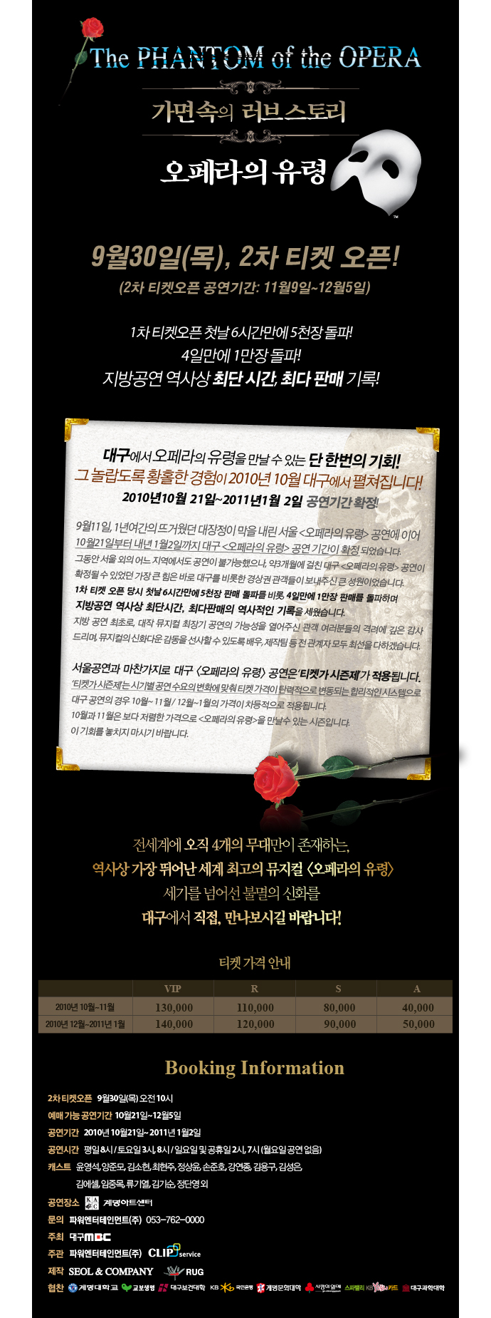 그동안 서울 외의 어느 지역에서도 공연이 불가능했으나, 약3개월에 걸친 대구 <오페라의 유령> 공연이 확정될 수 있었던 가장 큰 힘은 바로 대구를 비롯한 경상권 관객들이 보내주신 큰 성원이었습니다. 1차 티켓 오픈 당시 첫날 6시간만에 5천장 판매 돌파를 비롯, 4일만에 1만장 판매를 돌파하며 지방공연 역사상 최단시간, 최다판매의 역사적인 기록을 세웠습니다. 지방 공연 최초로, 대작 뮤지컬 최장기 공연의 가능성을 열어주신 관객 여러분들의 격려에 깊은 감사 드리며, 뮤지컬의 신화다운 감동을 선사할 수 있도록 배우, 제작팀 등 전 관계자 모두 최선을 다하겠습니다.