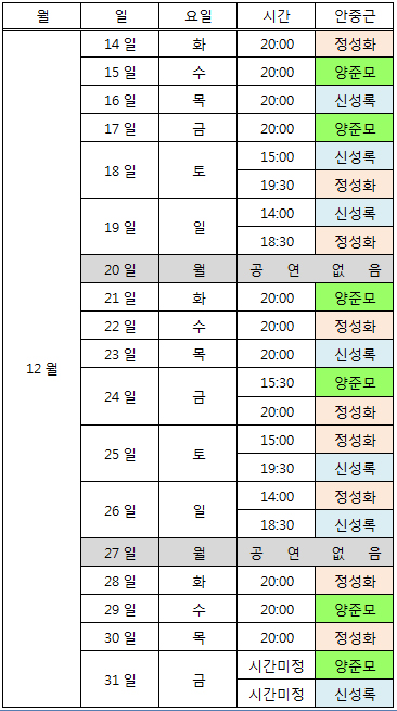 *** 공연시간 미정회차는 추후 공연시간 공지 될 예정이며 모든 스케줄은 배우의 사정에 의해 변경 될 수 있습니다.